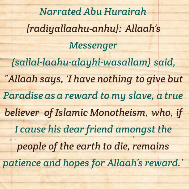 Narrated Abu Hurairah [radiyallaahu-anhu]: Allaah’s Messenger (sallal-laahu-alayhi-wasallam) said, ”Allaah says, ‘I have nothing to give but Paradise as a reward to my slave, a true believer of Islamic Monotheism, who, if I cause his dear friend amongst the people of the earth to die, remains patience and hopes for Allaah’s reward.’ [1]