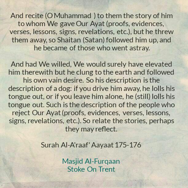 And had We willed, We would surely have elevated him therewith but he clung to the earth and followed his own vain desire. So his description is the description of a dog: if you drive him away, he lolls his tongue out, or if you leave him alone, he (still) lolls his tongue out. Such is the description of the people who reject Our Ayat (proofs, evidences, verses, lessons, signs, revelations, etc.). So relate the stories, perhaps they may reflect.