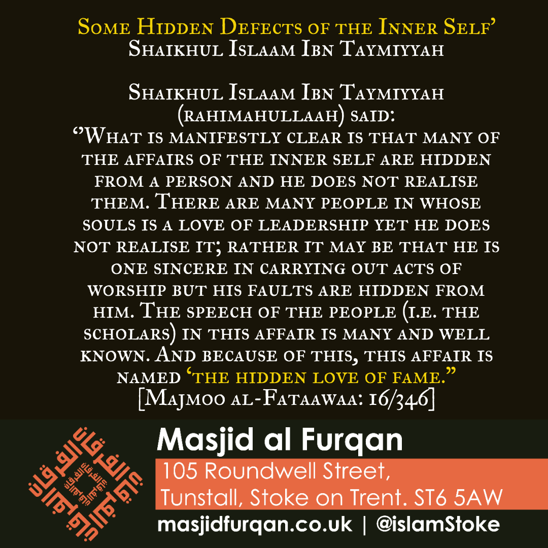 Shaikhul Islaam Ibn Taymiyyah (rahimahullaah) said: ‘’What is manifestly clear is that many of the affairs of the inner self are hidden from a person and he does not realise them. There are many people in whose souls is a love of leadership yet he does not realise it; rather it may be that he is one sincere in carrying out acts of worship but his faults are hidden from him. The speech of the people (i.e. the scholars) in this affair is many and well known. And because of this, this affair is named ‘the hidden love of fame.”