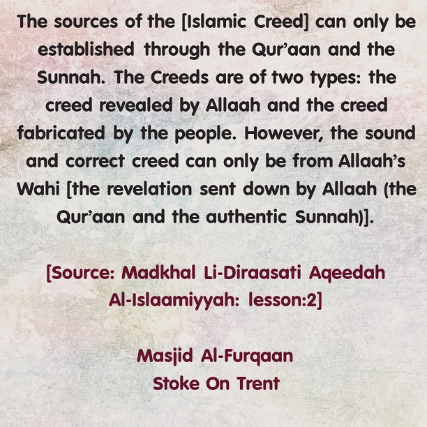The sources of the (Islamic Creed) can only be established through the Qur’aan and the Sunnah. The Creeds are of two types: (a) the creed revealed by Allaah and the creed fabricated by the people. However, the sound and correct creed can only be from Allaah’s Wahi [the revelation sent down by Allaah (the Qur’aan and the authentic Sunnah)].  Allaah (The Most High) informed us about Yoosuf (alayhis-salaam) and what said to his companions in the prison: