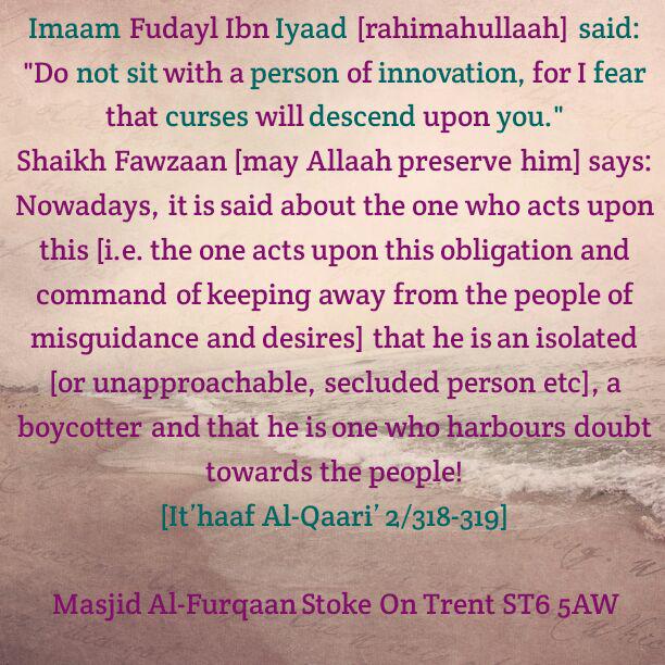 In this is a warning against sitting with the people of misguidance and desires, and against sitting, accompanying and listening to their speech or reading their books. So it is upon you [i.e. obligated on you] to be distant from these affairs. And Allaah’s Aid is sought! Nowadays, it is said about the one who acts upon this [i.e. the one who keeps away from the people of misguidance and desires] that he is an isolated [or unapproachable, secluded person etc], a boycotter and that he is one who harbours doubt towards the people.