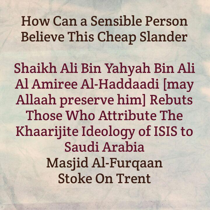 Saudi Arabia was among the first Islamic nations-from the beginning- to free itself from Daa’ish, Jabhatun Nusrah, Hizbula and other terrorist organizations through a well-known clarification.  Also, Daa’ish neither gives its loyalty to Saudi nor do they love Saudi, rather they have not ceased disseminating audios in which they excommunicate the rulers of Saudi and the scholars, and declaring that it is lawful to shed their blood. Thereafter, they targeted some of the mosques and places- causing explosions and suicide attacks as it is well known. Therefore, how can a sensible person believe this cheap slander [i.e. that Daa’ish is an extension or part of Saudi’s views or creed]?!
