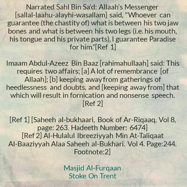 Narrated Sahl Bin Sa’d: Allaah’s Messenger (sallal-laahu-alayhi-wasallam) said, ”Whoever can guarantee (the chastity of) what is between his two jaw bones and what is between his two legs (i.e. his mouth, his tongue and his private parts), I guarantee Paradise for him.”[1]
