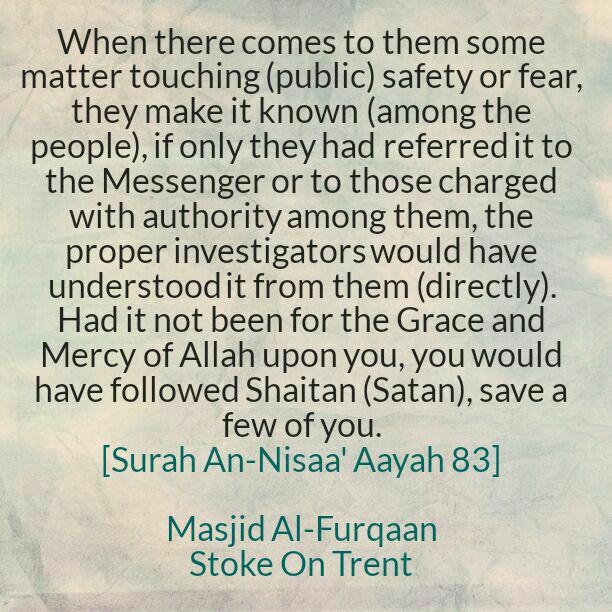 When there comes to them some matter touching (public) safety or fear, they make it known (among the people), if only they had referred it to the Messenger or to those charged with authority among them, the proper investigators would have understood it from them (directly). Had it not been for the Grace and Mercy of Allaah upon you, you would have followed Shaitaan (Satan), save a few of you.'[4:83]