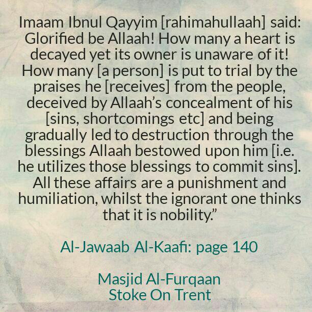 Glorified be Allaah! How many a heart is decayed yet its owner is unaware of it! How many [a person] is put to trial by the praises he [receives] from the people, deceived by Allaah’s concealment of his [sins, shortcomings etc] and being gradually led to destruction through the blessings Allaah bestowed upon him [i.e. he utilizes those blessings to commit sins]. All these affairs are a punishment and humiliation, whilst the ignorant one thinks that it is nobility.
