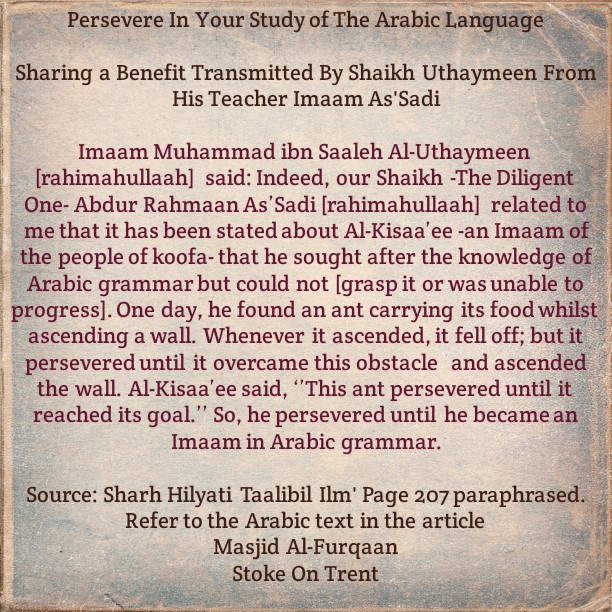 Imaam Muhammad ibn Saaleh Al-Uthaymeen [rahimahullaah] said: Indeed, our Shaikh -The Diligent One- Abdur Rahmaan As’Sadi [rahimahullaah] related to me that it has been stated about Al-Kisaa’ee -an Imaam of the people of koofa- that he sought after the knowledge of Arabic grammar but could not [grasp it or was unable to progress]. One day, he found an ant carrying its food whilst ascending a wall. Whenever it ascended, it fell off; but it persevered until it overcame this obstacle and ascended the wall. Al-Kisaa’ee said, ‘’This ant persevered until it reached its goal.’’ So, he persevered until he became an Imaam in Arabic grammar. [ref 1]