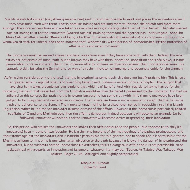 So, this person who praises the innovators and makes their affair obscure to the people -due to some truth they (i.e. innovators) have – is one of two (people): He is either one ignorant of the methodology of the pious predecessors and their stance against the innovators, and it is neither permissible for this ignorant one to speak nor is it permissible for the Muslims to listen to him; or he is one who has an objection to the truth because he knows the danger of innovation and the innovators, but he wishes to spread innovations. Nevertheless, this is a dangerous affair and it is not permissible to be lackadaisical with regards to innovation and its people, whatever that may be.